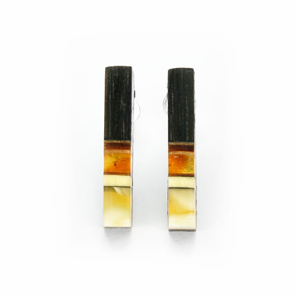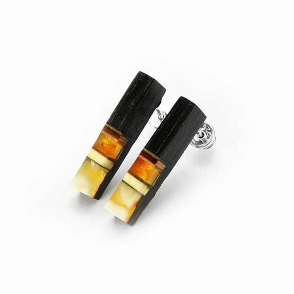 Para kolczyków na sztyft wykonanych ręcznie z wyselekcjonowanego bursztynu bałtyckiego, srebra wysokiej próby, złota płatkowego oraz szlachetnego drewna - czarnego dębu.