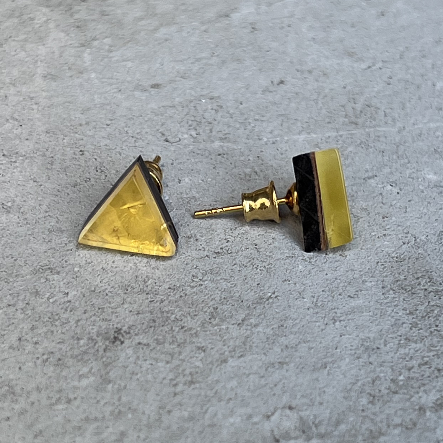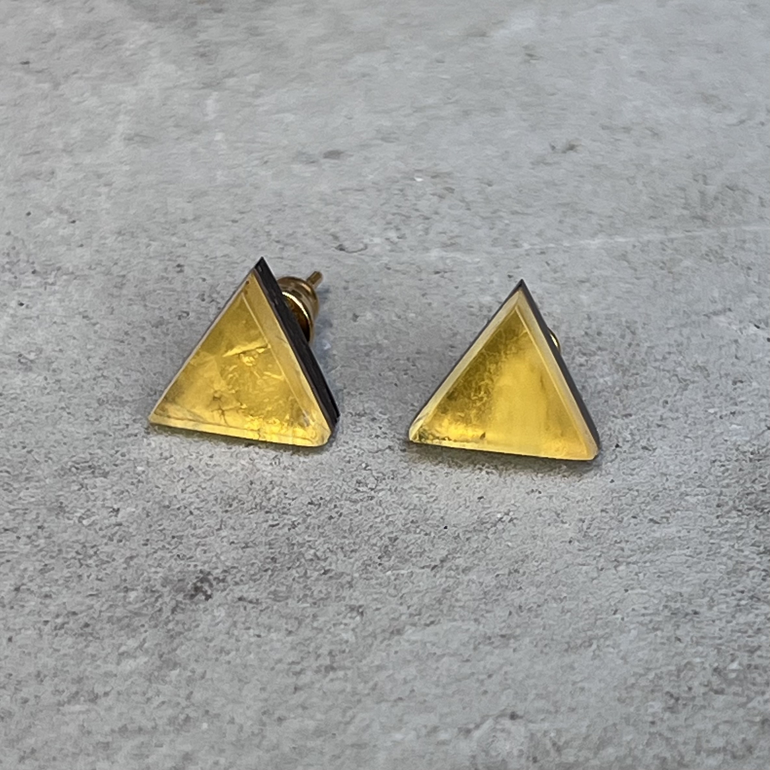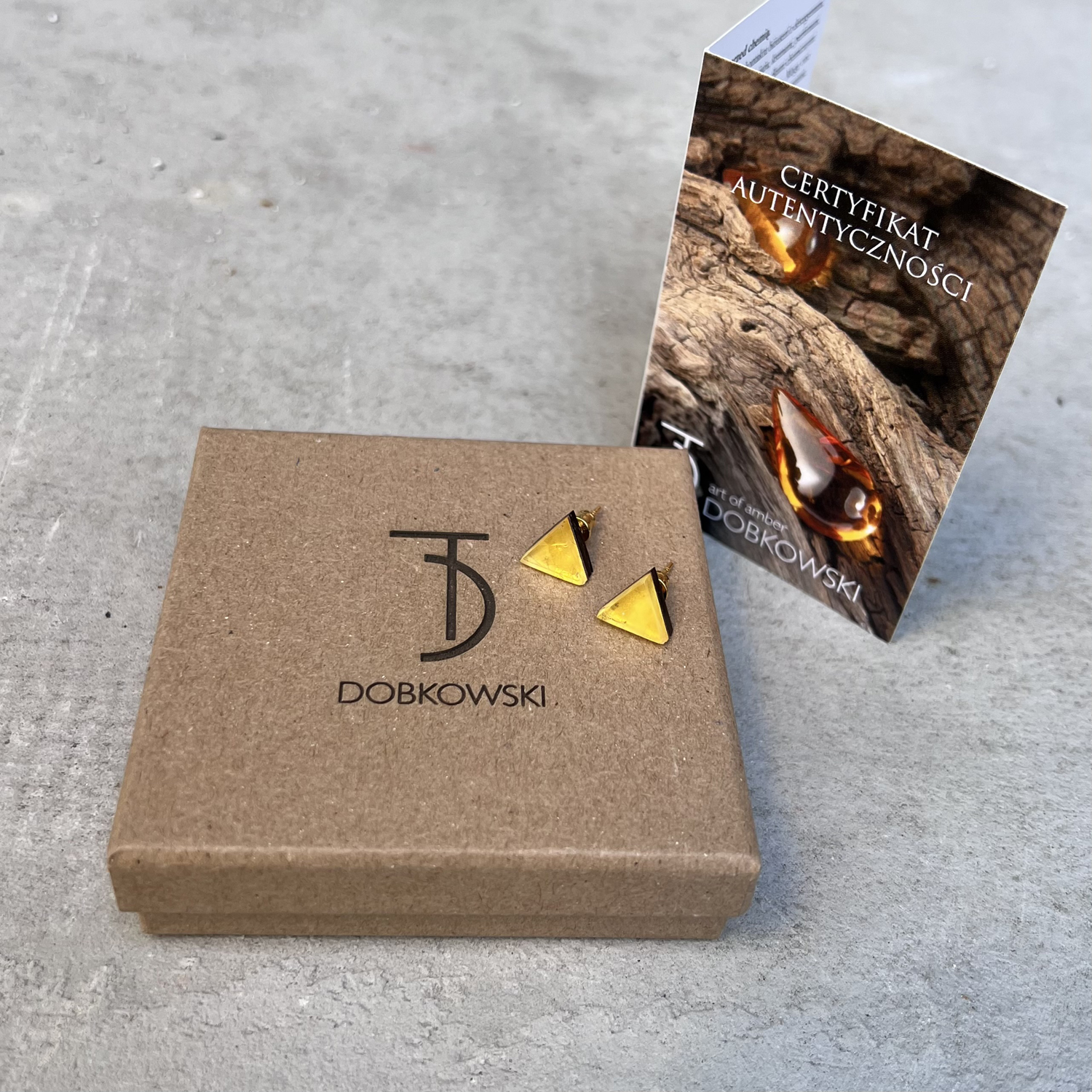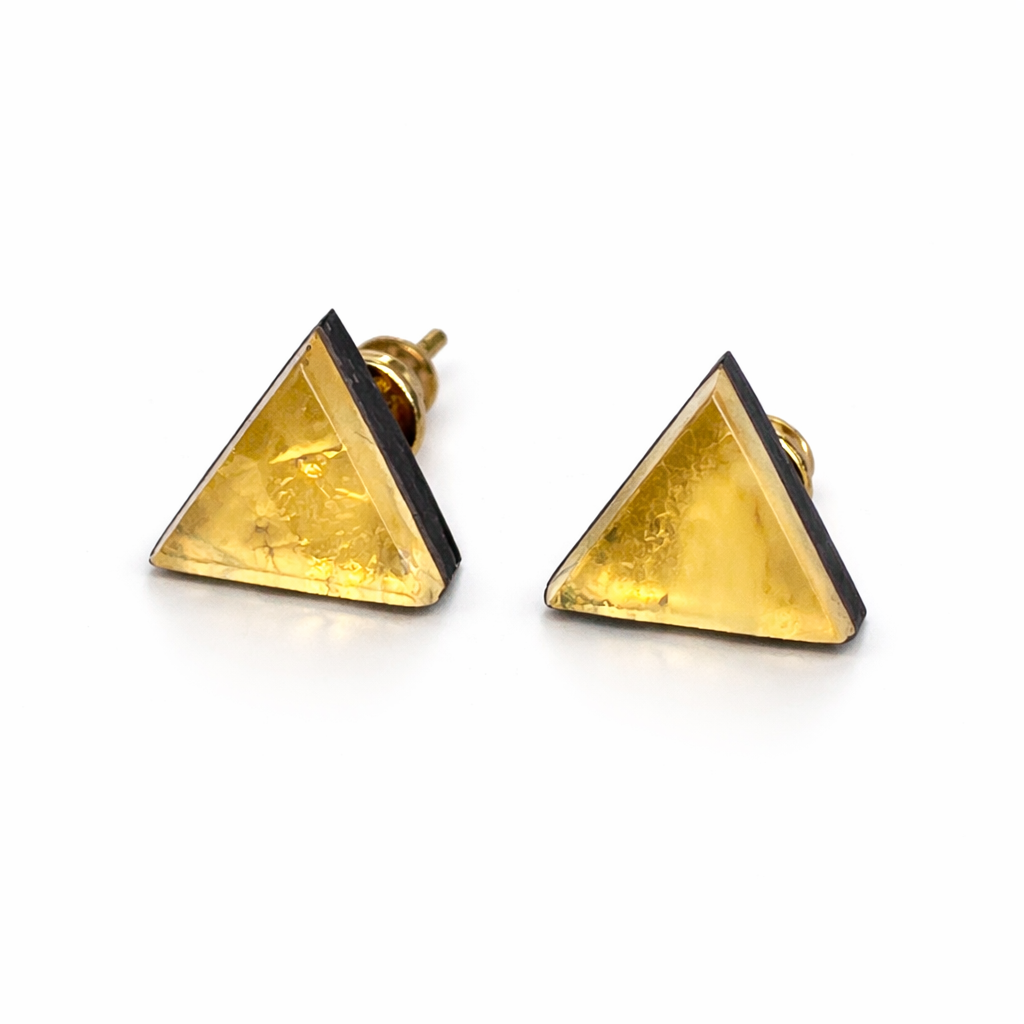 Para kolczyków trójkątów na sztyft wykonana ręcznie z wyselekcjonowanego bursztynu bałtyckiego, srebra wysokiej próby 925 pozłacanego 24 karatowym złotem, 23 karatowego złota płatkowego pod bursztynem oraz szlachetnego drewna czarnego dębu 1400 lat.