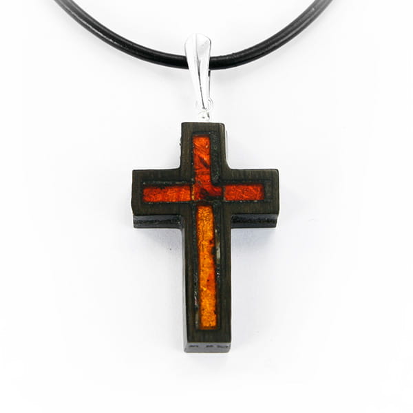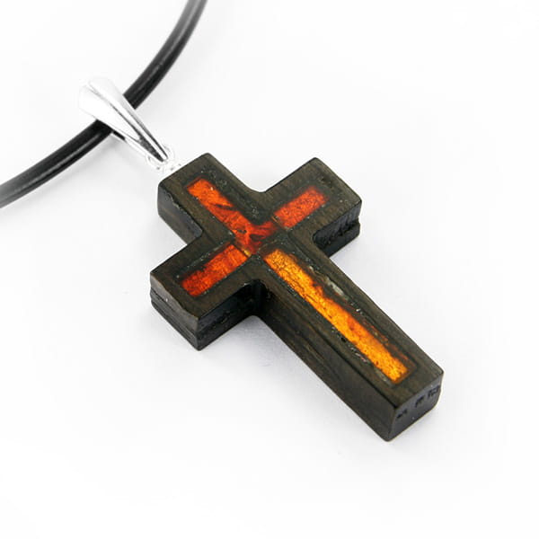 Wisiorek krzyżyk mały wykonany ręcznie z wyselekcjonowanego bursztynu bałtyckiego, srebra wysokiej próby, złota płatkowego oraz szlachetnego drewna - czarnego dębu.