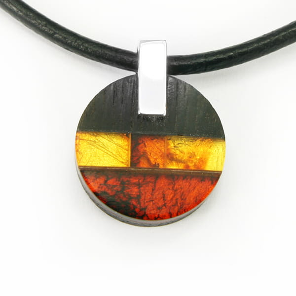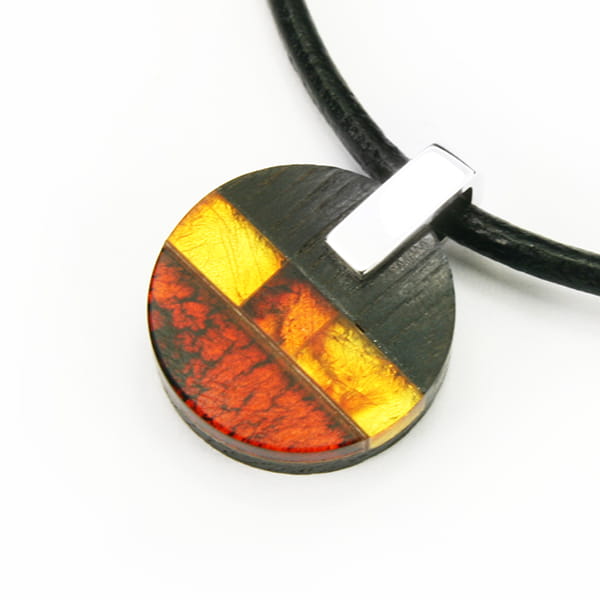 Wisiorek wykonany ręcznie z wyselekcjonowanego bursztynu bałtyckiego, srebra wysokiej próby, złota płatkowego oraz szlachetnego drewna - czarnego dębu.