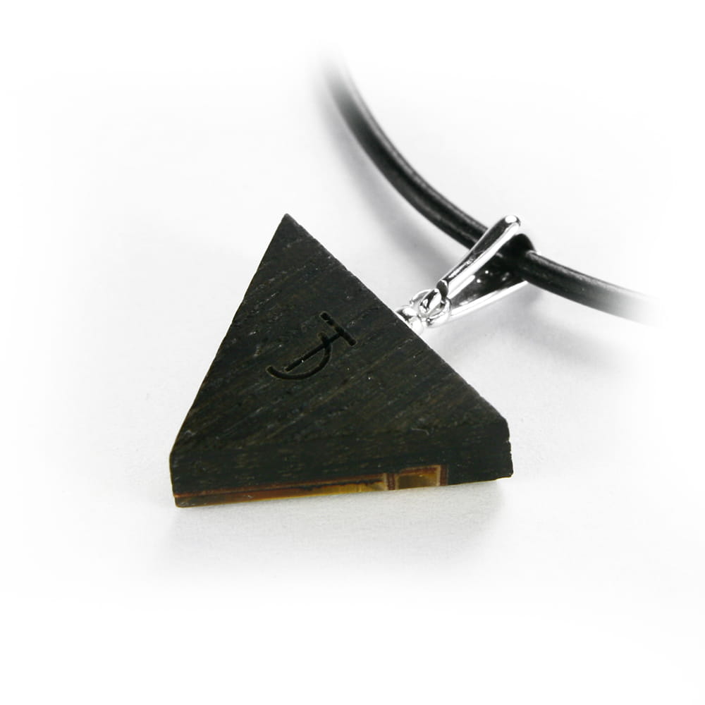 Wisiorek trójkątny, wykonany ręcznie z wyselekcjonowanego bursztynu bałtyckiego, srebra wysokiej próby, złota płatkowego pod bursztynem oraz szlachetnego drewna.